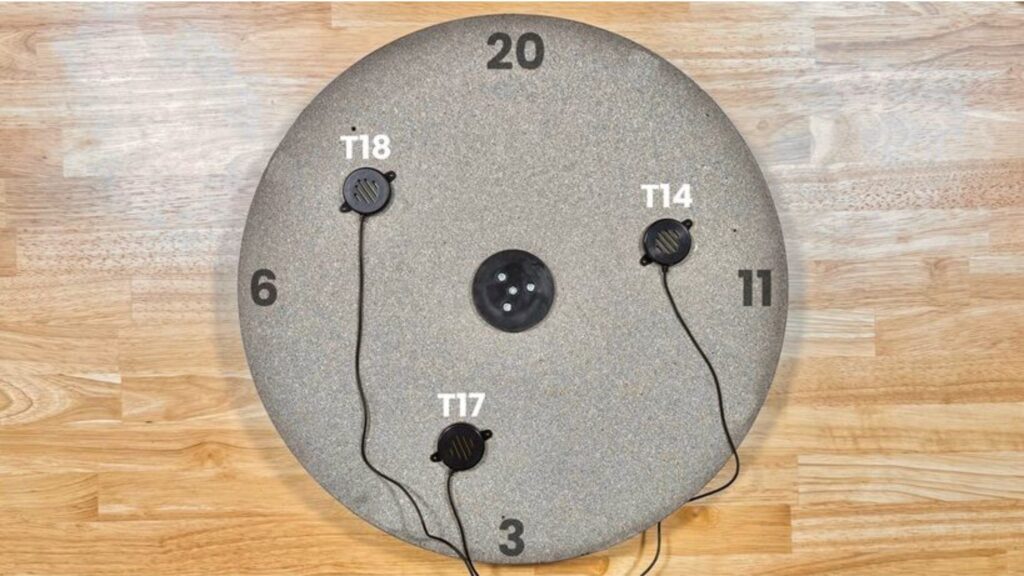 ダーツボード[T18]、[T14]、[T17]エリアの裏側付近にエコーユニットを取り付けます。