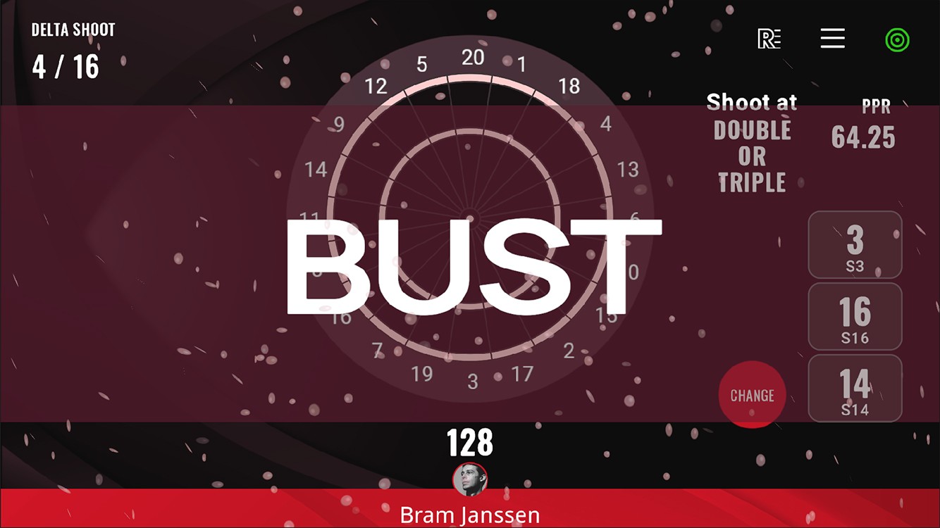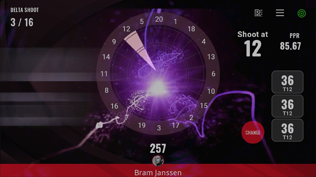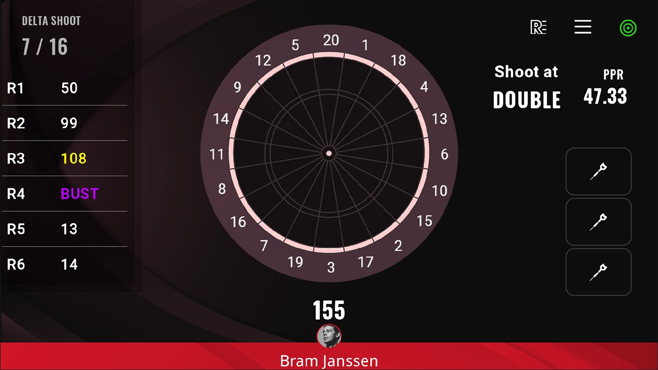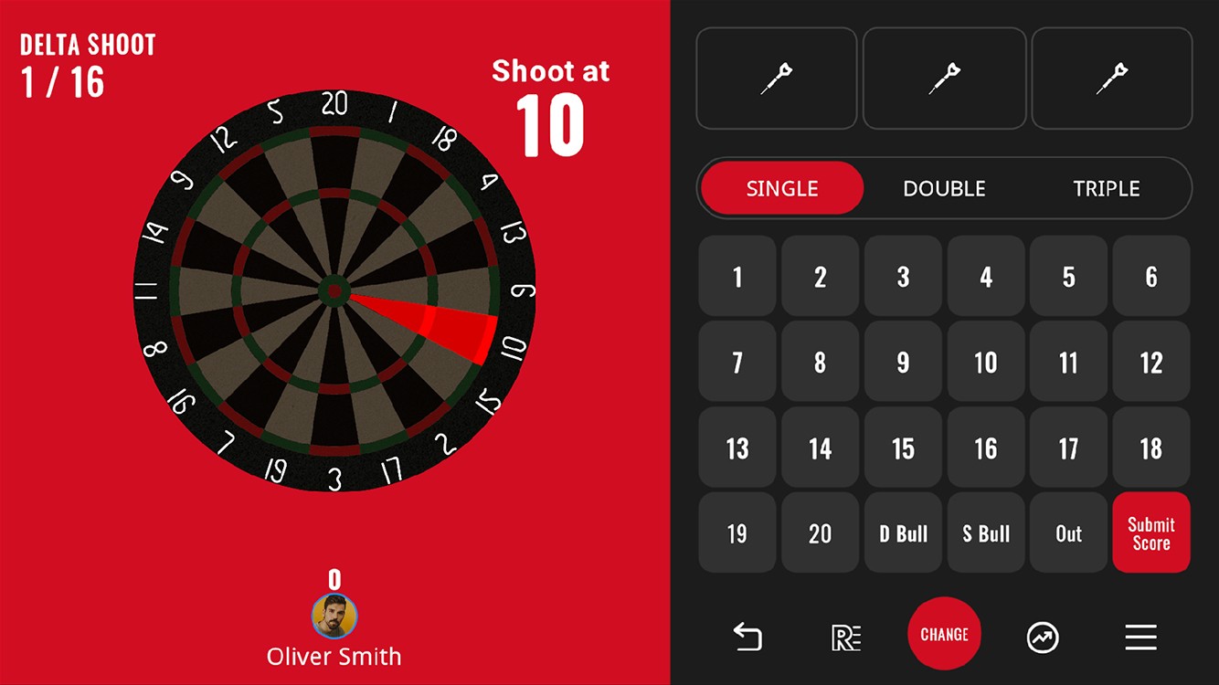 DELTA SHOOT has 16 rounds. Player throws 3 darts at the designated area each round. The designated areas will be 10,11,12,DOUBLE or TRIPLE,13,14, DOUBLE,15,16,17, TRIPLE, 18,19,20, BULL, D-BULL starting from the first round.