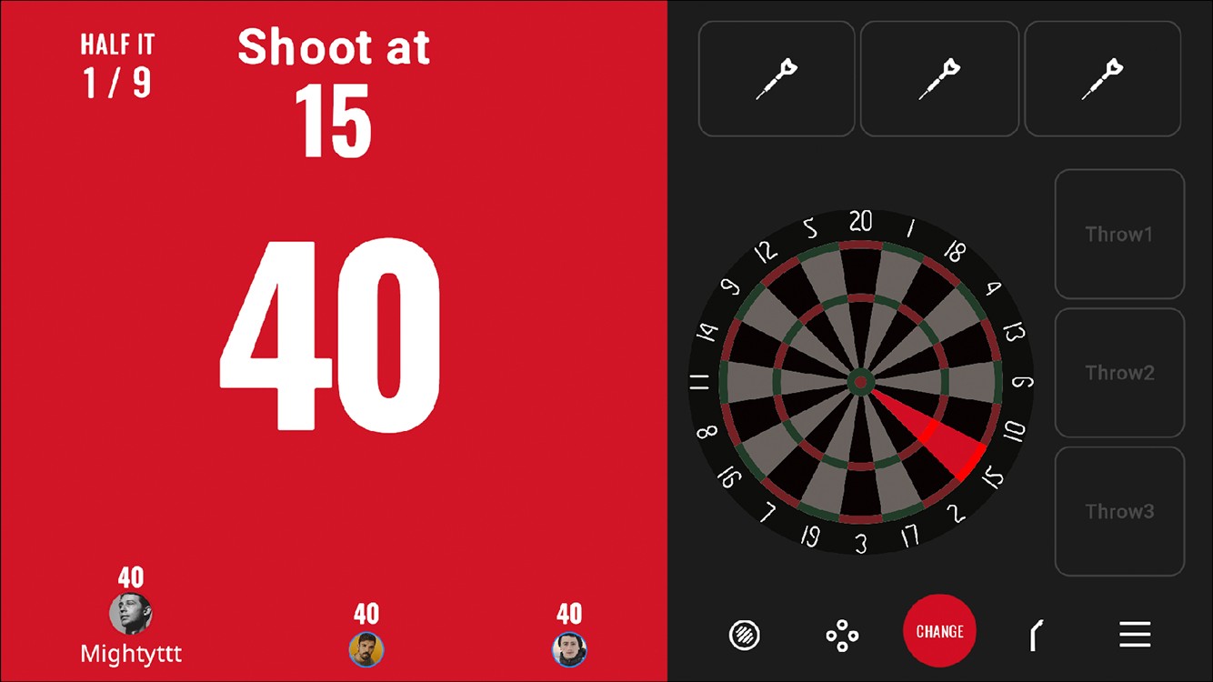 You have 40 points as your score at the beginning. You earn a point of the number designated if darts hit at the number. However, you lose half of your score if failing to hit at the number. Try to hit a dart once at least at the designated number!.