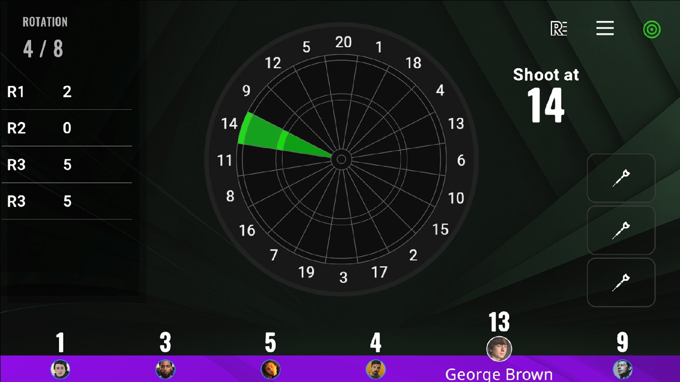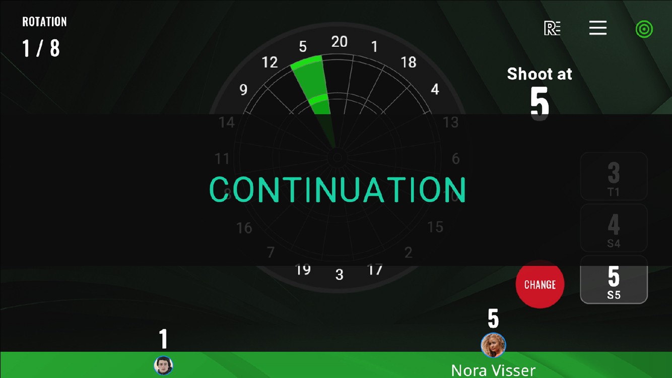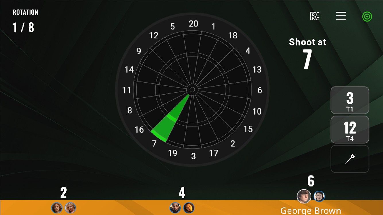 ROTATION is a practice game of starting from 1 to 20 in raw and completing 3 BULL marks. An assigned target is shown by flashing. Players can continue their turns if they are successful to hit at a target in the third shot. If playing very well, you can reach Bull even at first turn.