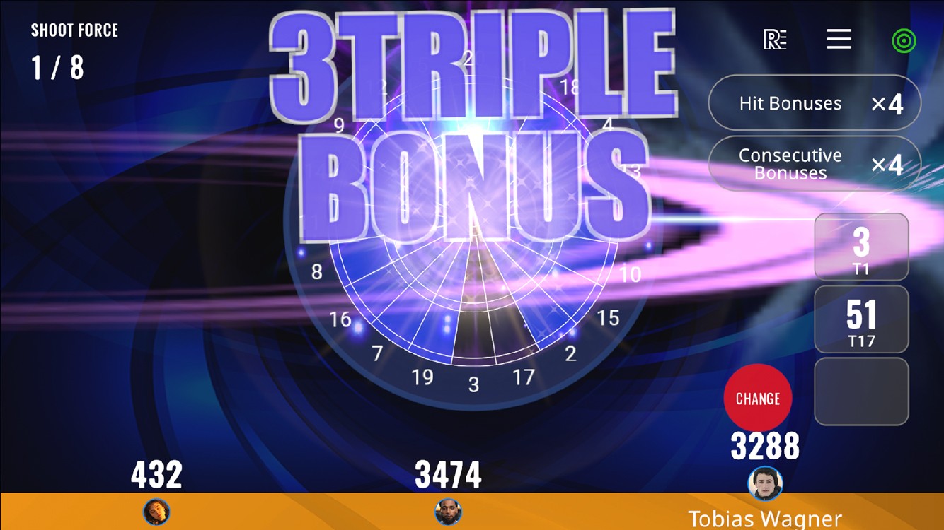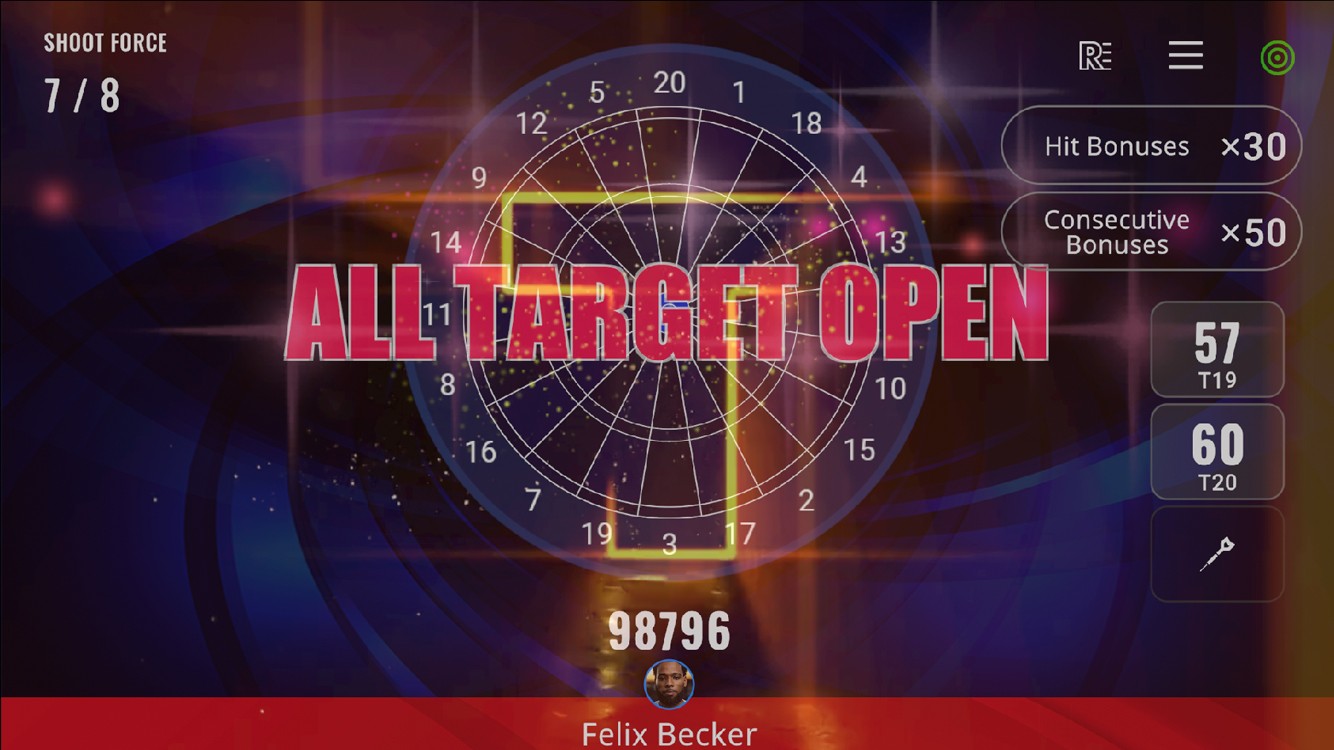 If you hit all targets from 1 to 20, BULL is released as a target. You have a great chance to mark a high score, Single BULL for 10 thousand points, Double BULL for 100 thousand points! If you shoot all at Triples and at Double BULL with rest of darts, you get max 1.5 million points ! Let’s try to achieve the highest score!