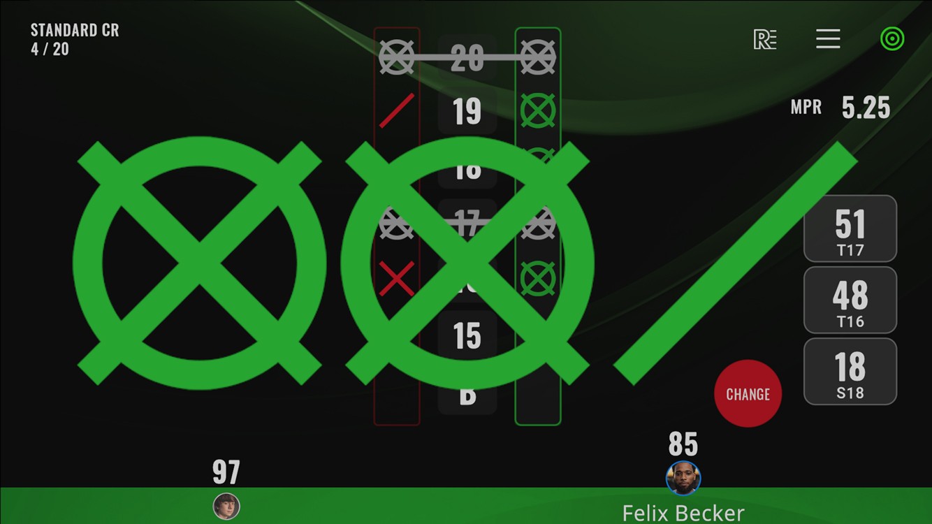 CRICKET is a strategic game where you claim territory by hitting specific numbers on the dartboard. You score points from your claimed areas while trying to block your opponent from doing the same. The game uses seven target numbers: 20, 19, 18, 17, 16, 15, and BULL (the center). When your darts hit these areas, they're shown as marks like / or ×. Different sections of the board give you different marks depending on where your dart lands.