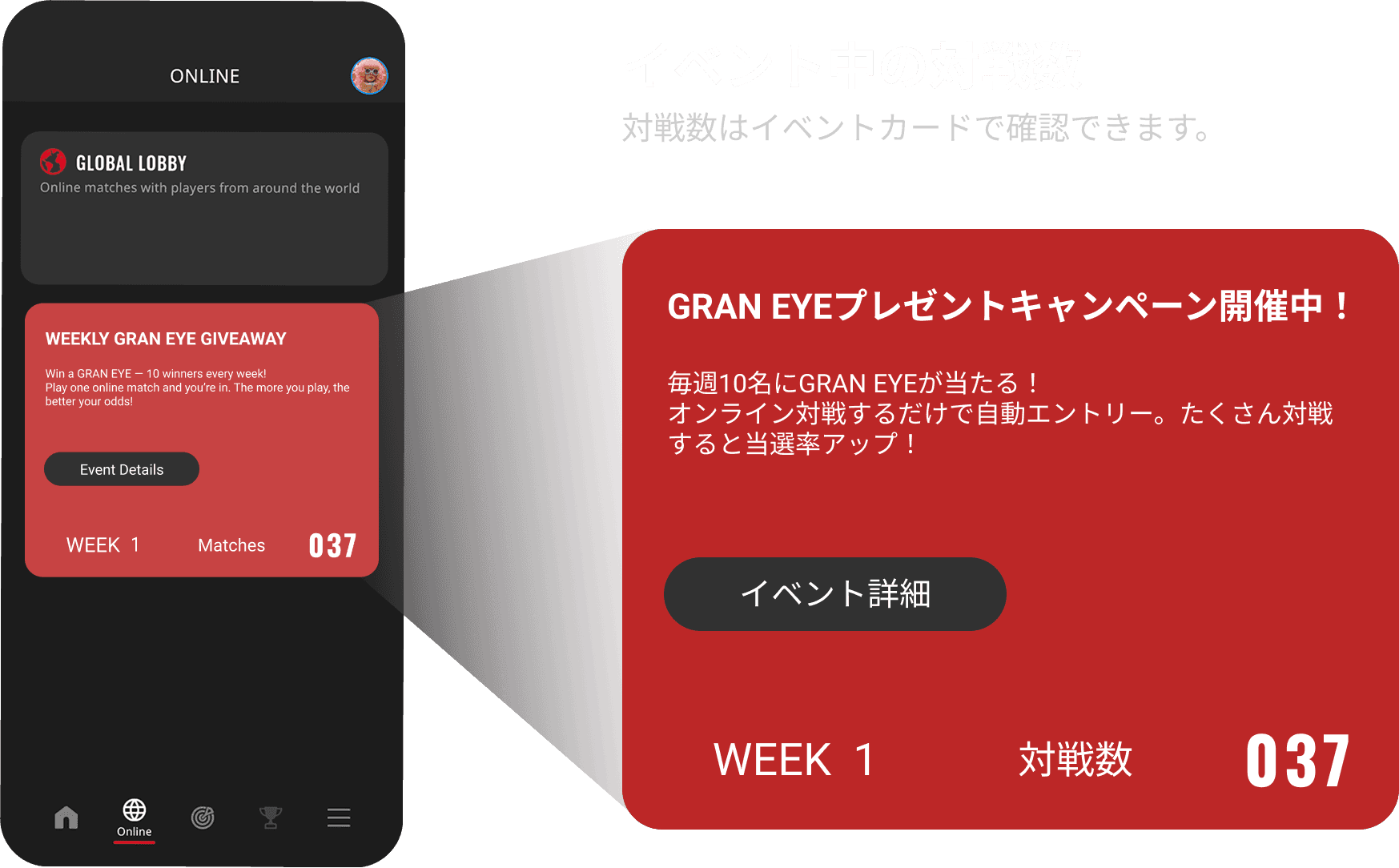 イベント開催期間中にプレイしたオンライン対戦のみがカウントされます。週ごとのイベント期間が終了すると、対戦数はリセットされます。