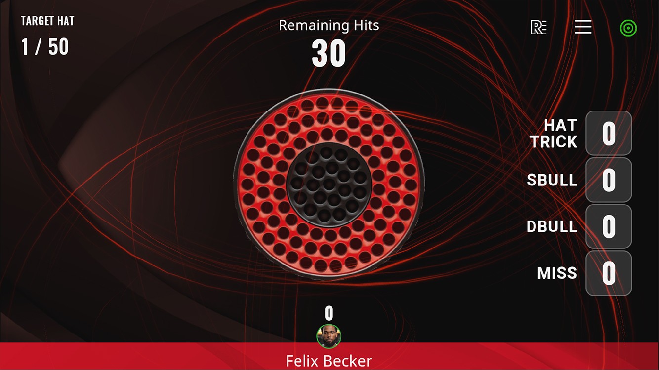 自分のレベルに合わせてゲーム開始時に(5、10、30、50、100)の中から目標数を決定します。HAT TRICKが出せると1回成功となります。自分で決めたその目標数に向かってひらすらHAT TRICKに挑戦!練習の質を上げていきましょう。しっかりと目標を設けて投げ込みましょう。※こちらのゲームは3 IN THE BLACKも表示上はHATで表示されます。